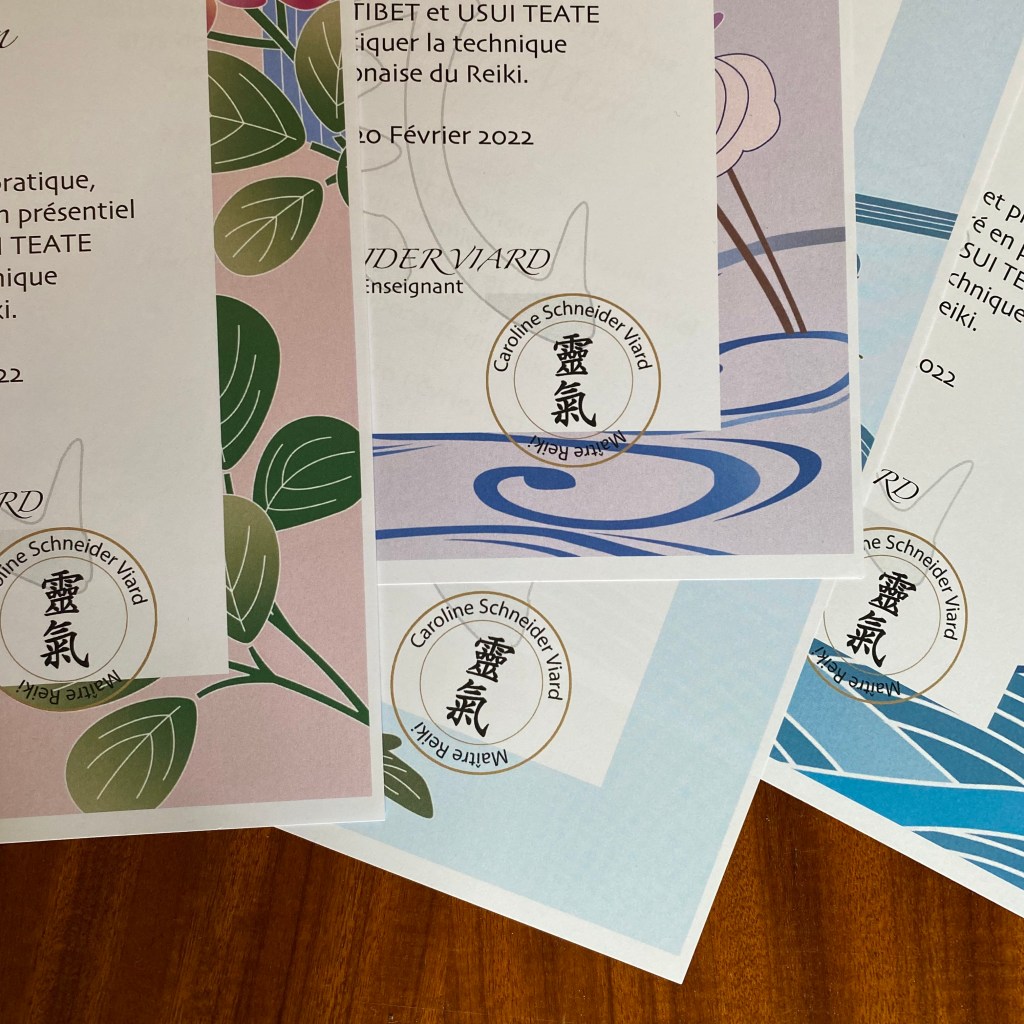 J’ai choisi de dessiner le kanji originel du reiki pour le mettre au centre. En haut votre nom sera inscrit, en bas votre niveau en reiki (praticien reiki pour les niveaux 1 et 2, maître praticien reiki pour le niveau 3 et maître enseignant pour le niveau 4) plus, si vous le désirez, le nom de la lignée Reiki, que vous pratiquez.