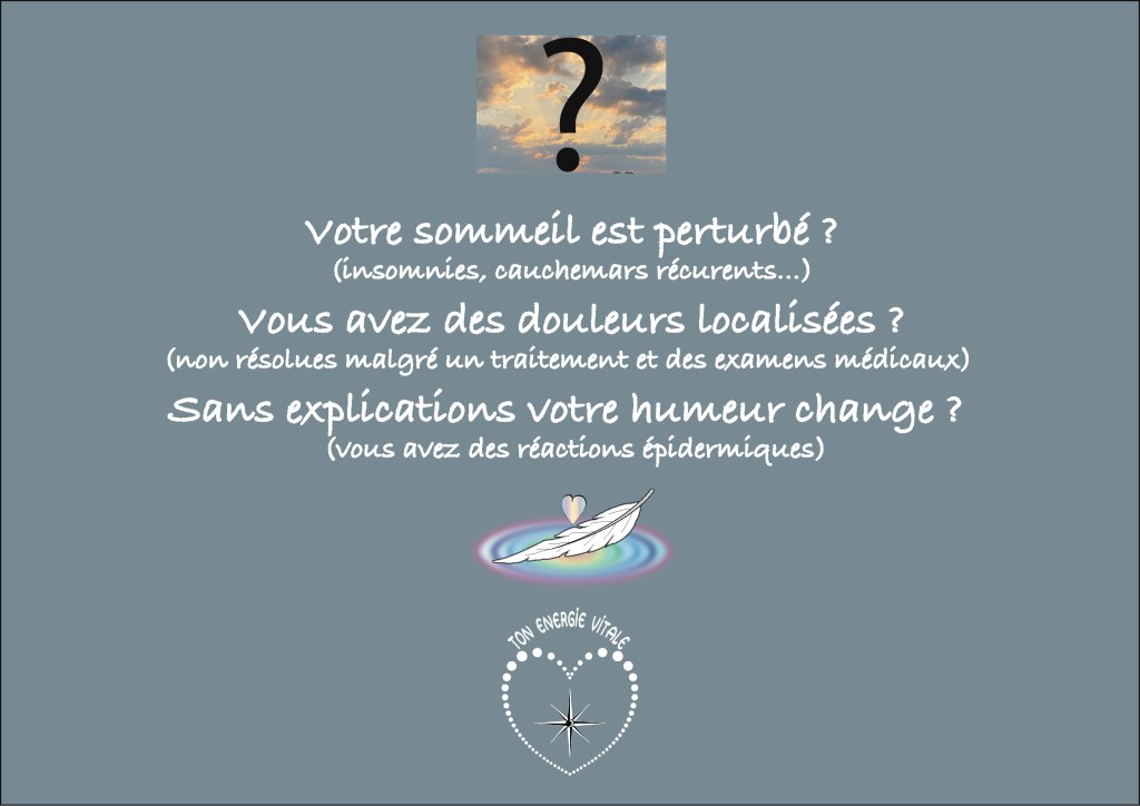 À notre insu, sans le savoir, nos corps énergétiques peuvent servir d’hébergement à des entités. Elles s’accrochent à nous, perturbent notre organisme, font baisser notre taux vibratoire. Et quand nous avons un point faible, leur présence se manifeste par « le réveil » de notre point faible. Par exemples, j’ai une cliente qui a eu plusieurs fois besoin de mes services : elle est chanteuse lyrique, et, quand elle est « squattée », sa voix est atteinte, elle ne peux plus pousser la note. Dans les quelques minutes qui suivent mon intervention, elle peut de nouveau chanter comme si rien ne c’était passé. Pour une autre personne, son point faible est son pied. Tout d’un coup, sans raisons apparentes, une zone du pied s’enflamme, gonfle et devient douloureuse. Je pense à un dernier exemple, un monsieur qui dormait beaucoup nuit et jour. Il n’était plus en capacité d’avoir une vie normale, ne serait-ce aller faire quelques courses avec son épouse. Le jour où je suis intervenue, en début d’après-midi, il faisait une sieste, c’était convenu ainsi. À son réveil, il se sentait en super forme au point de, de lui-même, aller faire des courses, chose qu’il n’avait pas pu faire depuis fort longtemps ; et sa bonne forme a perduré ! Cela peut également se manifester par des changements d’humeur, vous qui êtes de nature calme et joyeuse, tout d’un coup vous avez des sautes d’humeurs, vous êtes même agressif, vous avez des réactions épidermiques, démesurées.