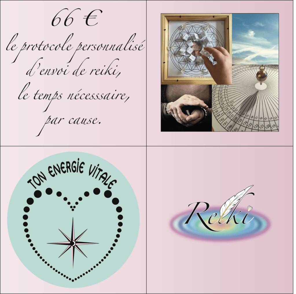 - 66€ la mise en place d’envois de reiki à distance par cause quel que soit le nombre de jours d’envois (avec entretien téléphonique au préalable).